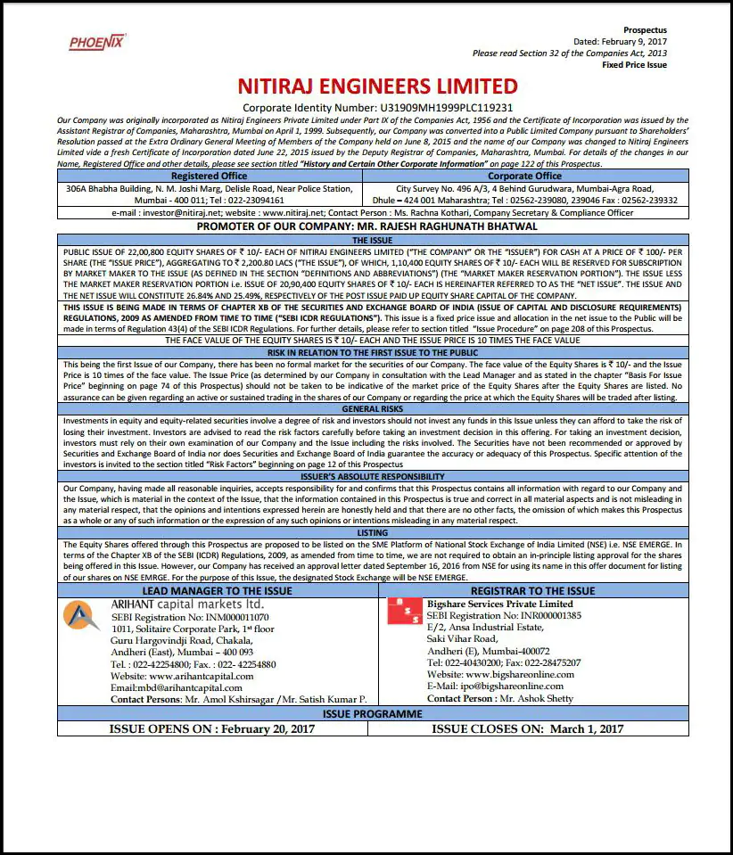 IPO View Prospectus Download Prospectus View Abridged Prospectus Download Abridged Prospectus In case of any queries regarding our IPO or any investor grievances, please send us an email on the following email id. Investor@nitiraj.net